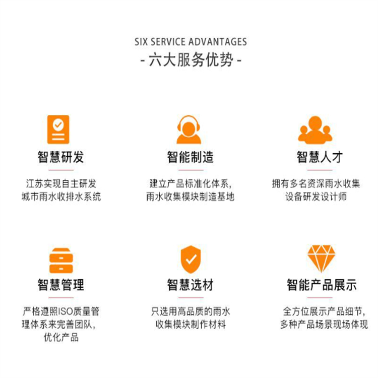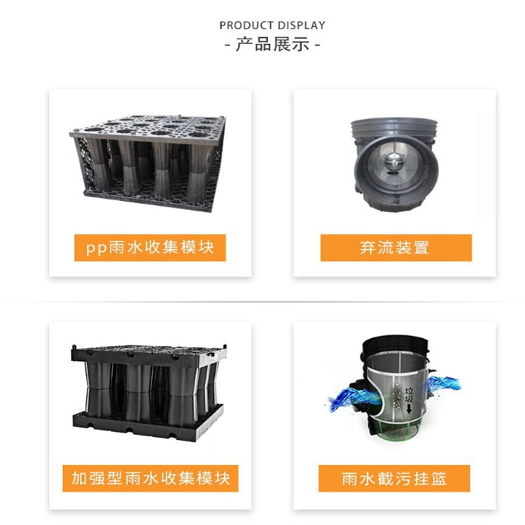 單體模塊采用PP材料注塑而成,根據(jù)收集的雨水量和用戶的需求,組合成不同形狀和不同體積,并可根據(jù)使用場合承載力的不同,選擇不同承強(qiáng)度的PP蓄水模塊。