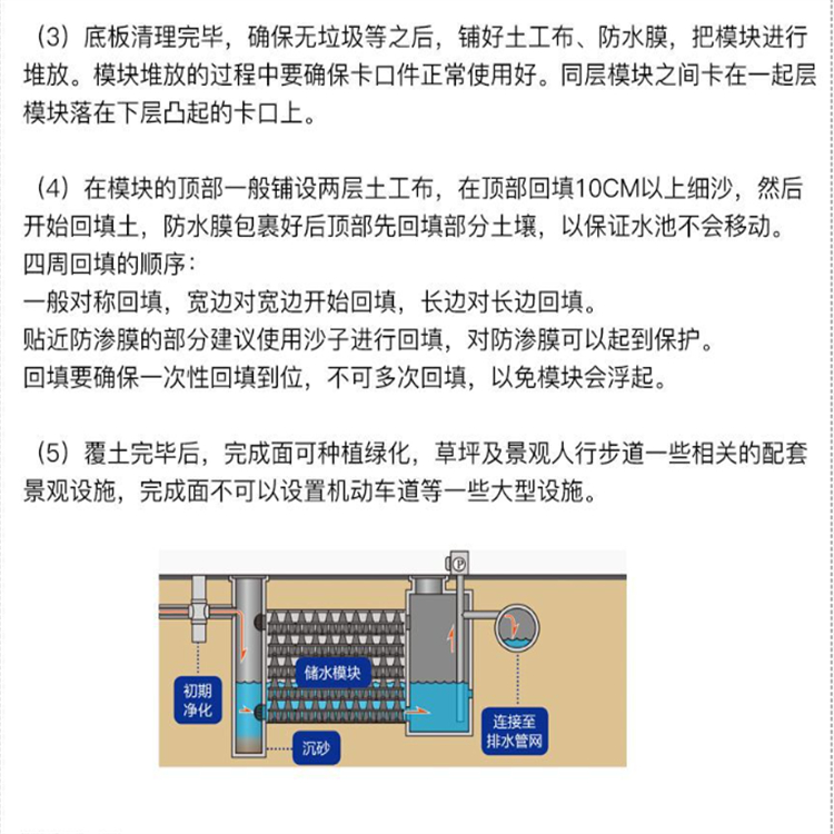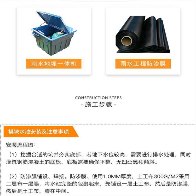 雨水收集模塊,是雨水收集利用系統(tǒng)中的一部分,PP模塊蓄水池由多個雨水收集PP模塊單體組合而成。在建筑工地現(xiàn)場拼合成整體,并通過包裹防滲材料,形成地下蓄水池。在水池周圍根據(jù)工程需要包裹防滲土工布或透水土工布,組成貯水池、滲透池、調(diào)蓄池不同類型,在雨水的存儲回用、道路沿線排水和蓄水、滲透排水領(lǐng)域都有廣泛應(yīng)用。用雨水收集模塊組裝水池,安裝方便,承載力大,不滋生蚊蠅及藻類,且在臨建地區(qū)域使用后,可以拆除遷移到其它區(qū)域繼續(xù)使用。該設(shè)備適用于大型建筑小區(qū)、工業(yè)園區(qū)、廣場及廠房區(qū)域的雨水收集利用。雨水收集模塊貯水池能有效的將收集來的雨水進(jìn)行存儲,這些存儲的雨水資源,經(jīng)過處理后可用于沖洗廁所、清洗路面、澆灌草坪、水景補(bǔ)水等等。