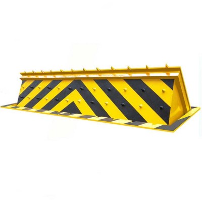路障阻車器由厚質(zhì)PVC塑料作為活動(dòng)支座,不銹鋼硬質(zhì)刺針構(gòu)成。不銹鋼針有中心回通氣答孔。刺針扎入車胎后,胎內(nèi)空氣便會(huì)直接從中心通氣孔中快速釋放。當(dāng)車輪接觸到不銹鋼釘路障時(shí),由于行駛中的壓力,使車輪壓向路障上的不銹鋼釘,不銹鋼釘會(huì)隨著車論移動(dòng)的方向刺入車胎,車胎中氣體便從刺針內(nèi)孔泄出。達(dá)到有效攔截車輛的目的。