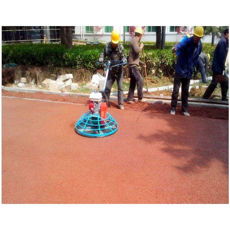 透水混凝土屬干性混凝土料,其初凝快,攤鋪必須及時。對于人行道面,大面積施工采用分倉方式進行攤鋪,其松鋪系數(shù)為1.1。將混合物均勻攤鋪在工作面上,用刮尺找準平整度和控制一定的泛水度,用抹刀抹平,抹合不能有明水。