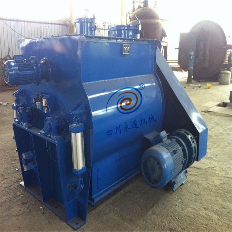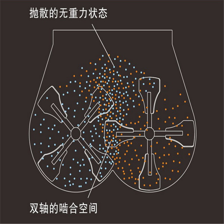 設(shè)工作原理:YT系列臥式無(wú)重力混合機(jī),筒體內(nèi)裝有雙軸旋轉(zhuǎn)方向相反的槳葉,槳葉呈重疊狀并形成一定的角度,槳葉旋轉(zhuǎn)將物料拋向空間流動(dòng)層,產(chǎn)生瞬間失重(無(wú)重力),相互落入對(duì)方區(qū)域內(nèi),物料來(lái)回?fù)交?,中央部位形成一個(gè)流態(tài)化的失重區(qū)(無(wú)重力區(qū))和旋轉(zhuǎn)渦流,物料并沿軸向徑向運(yùn)動(dòng),從而形成復(fù)合循環(huán)迅速達(dá)到均勻混合。