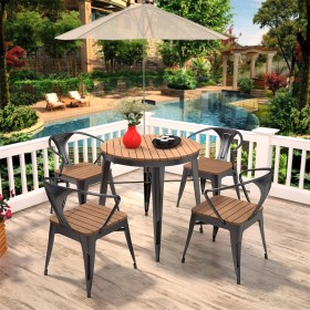這是一款采用鐵藝設(shè)計(jì)結(jié)合實(shí)木的一款休閑桌椅。實(shí)木的采用使得整個(gè)桌面十分的光滑,木質(zhì)的紋理上也是十分的優(yōu)美豐富。經(jīng)過特殊的技術(shù)處理具有良好的防腐性能, 能滿足抵抗風(fēng)雨、日曬等的戶外環(huán)境的要求。在這款休閑桌椅上的設(shè)計(jì)上,使用的金屬材質(zhì),使得結(jié)構(gòu)更加的穩(wěn)固,緊密結(jié)實(shí)。采用的實(shí)木設(shè)計(jì)沒有任何的氣味,環(huán)保舒適。