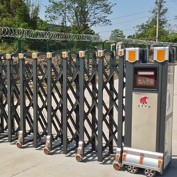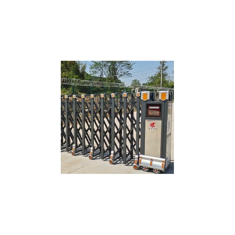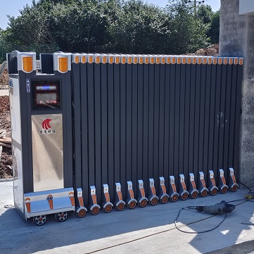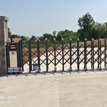 5.伸縮電動(dòng)門體采用優(yōu)質(zhì)不銹鋼或鋁合金等材料制作,采用平行四邊形原理交接,伸縮靈活。驅(qū)動(dòng)器采用特種電機(jī)驅(qū)動(dòng),蝸桿蝸輪減速,設(shè)有手動(dòng)離合器,停電時(shí)可手動(dòng)啟閉;