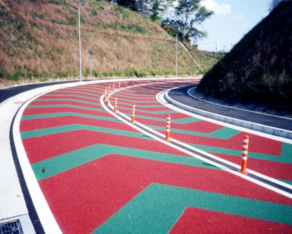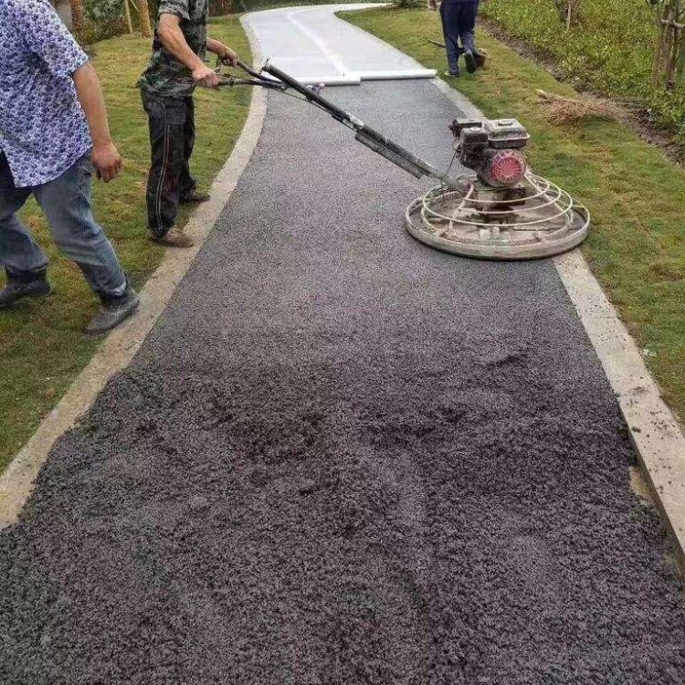 露骨彩色透水混凝土地坪是一種多孔、輕質(zhì)、無細骨料混凝土,由粗骨料表面包覆一層膠結(jié)料相互粘結(jié)而形成孔穴均勻分布的蜂窩狀結(jié)構(gòu),故具有透水、透氣和質(zhì)量輕的特點。面層施工必須計算前期高度,合理控制高度能夠使壓實后與設(shè)計高度一致,符合道路面層的設(shè)計要求,攤平后采用機械進行碾壓,以保證透水混凝土路面的密實性,從而保證混凝土的強度。