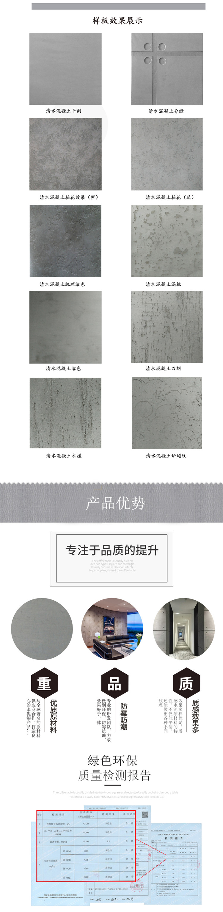 水泥漆是裝飾環(huán)保綠色建筑涂料,不僅適用內(nèi)墻裝飾上,打造專屬工業(yè)風、漫咖啡、復古風等裝飾效果,同時適用于室外,建筑外墻表面裝飾混凝土質(zhì)感,水泥漆產(chǎn)品不僅在裝飾性能上佳而且裝飾效果可隨客戶要求定制!