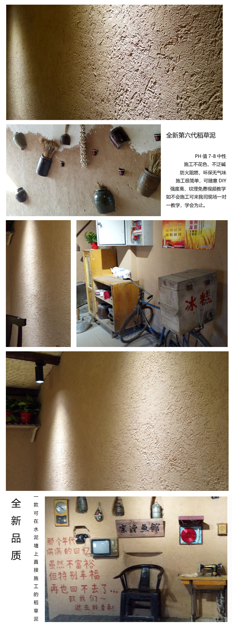 ?稻草漆,曾經(jīng)是原始、樸素、溫馨宜人的建筑材料。我公司技術(shù)經(jīng)過(guò)不斷的實(shí)驗(yàn),打樣加工,工藝試樣;現(xiàn)已成熟地利用稻桿、蛭石粉、微空粉末、石英粉等天然材料制成干粉單組份生態(tài)稻草漆,為迎合現(xiàn)代人親近自然的健康心理要求,自然樸實(shí)的墻面帶給主人的是:在喧囂的城市間,盡情體會(huì)返璞歸真,回歸自然的感覺(jué),讓您時(shí)刻擁有自然大方的鄉(xiāng)土氣息,讓您始終感覺(jué)到置身于寧?kù)o、古樸、粗狂的環(huán)境中。