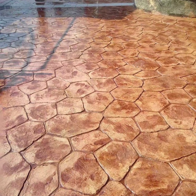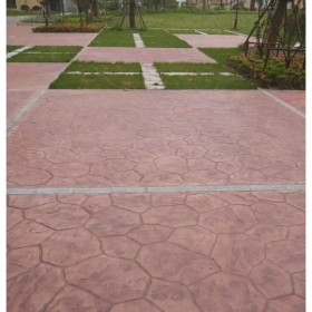 5、使用藝術(shù)地坪模具對(duì)地坪面層進(jìn)行紋理處理。藝術(shù)地坪模具應(yīng)配套使用,首先確定好紋理的分布方向,選好一塊模具放置的位置和角度,然后其它的模具依次緊貼一塊模具放置。彩色混凝土藝術(shù)地坪壓模采用壓模,壓模應(yīng)由技術(shù)較好的人員進(jìn)行作業(yè)以保證壓紋深度一致和模具放置的準(zhǔn)確性。