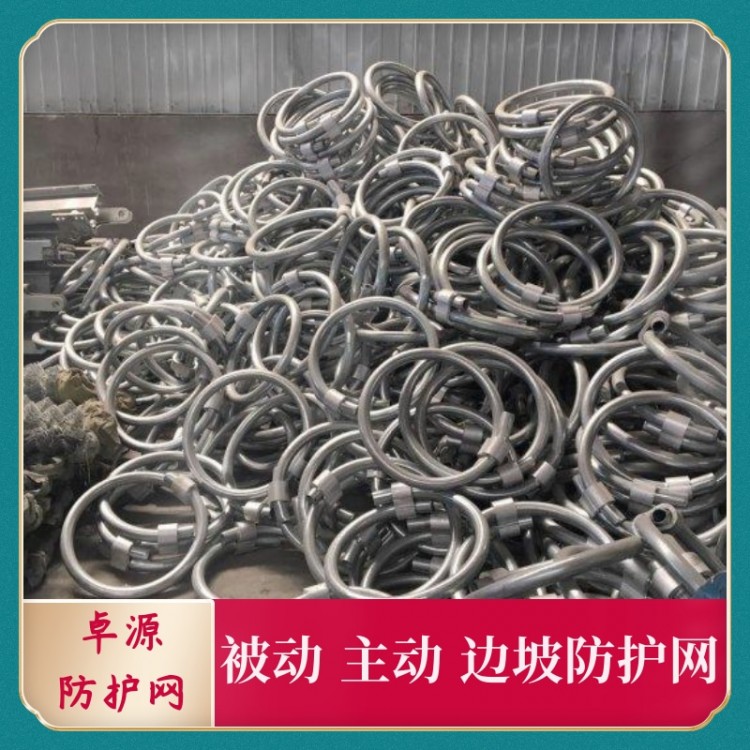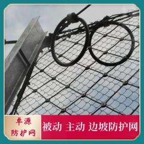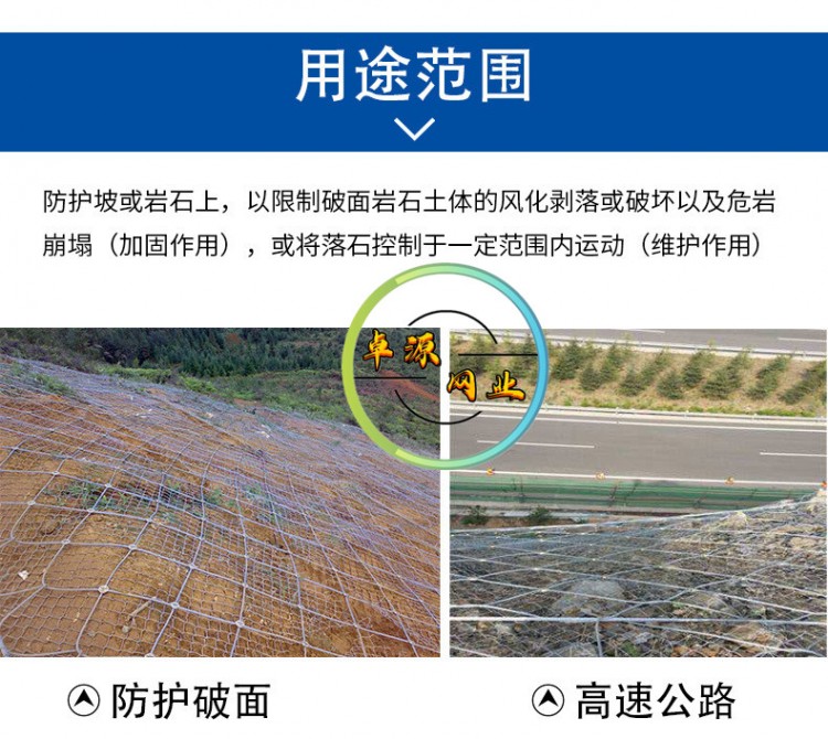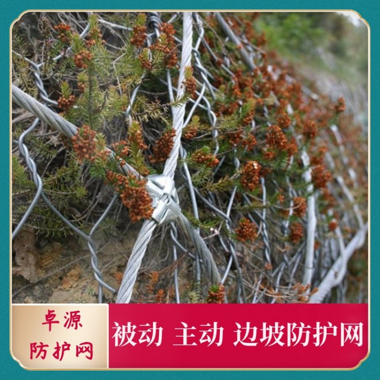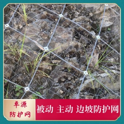 邊坡防護(hù)網(wǎng)有主動防護(hù)與被動防護(hù),主動防護(hù)系統(tǒng)是以鋼絲繩網(wǎng)為主的各類柔性網(wǎng)覆蓋包裹在所需防護(hù)斜坡或巖石上,以限制坡面巖石土體的風(fēng)化剝落或破壞以及為巖崩塌(加固作用),或?qū)⒙涫刂朴谝欢ǚ秶鷥?nèi)運(yùn)動(圍護(hù)作用)。被動防護(hù)是由鋼絲繩網(wǎng)、環(huán)形網(wǎng)、(需攔截小塊落石時附加一層鐵絲格柵)、固定系統(tǒng)(錨桿、拉錨繩、基座和支撐繩)減壓環(huán)和鋼柱四個主要部分構(gòu)成。鋼柱和鋼絲繩網(wǎng)連接組合構(gòu)成一個整體,對所防護(hù)的區(qū)域形成面防護(hù),從而阻止崩塌巖石土體的下墜,起到邊坡防護(hù)作用。