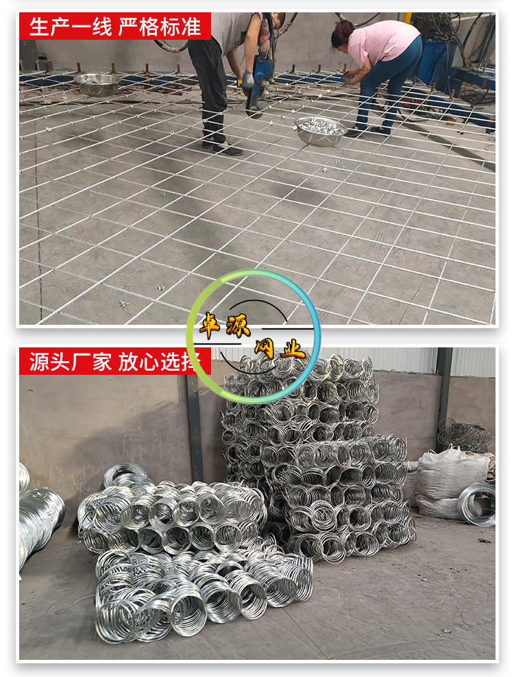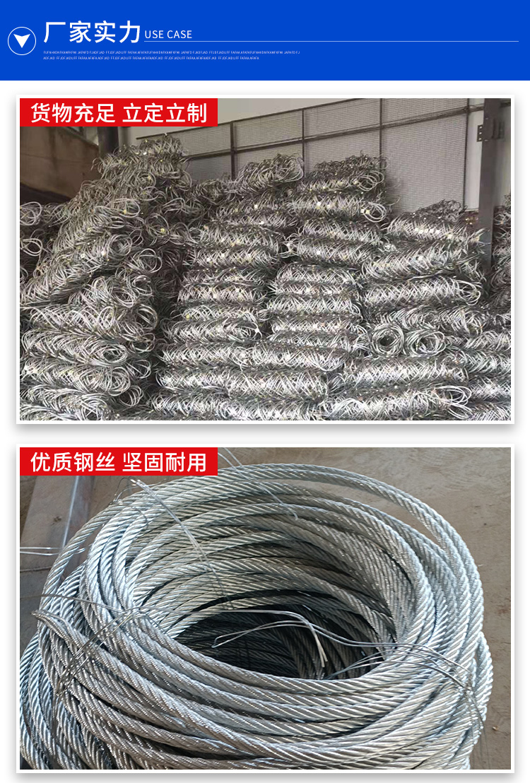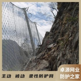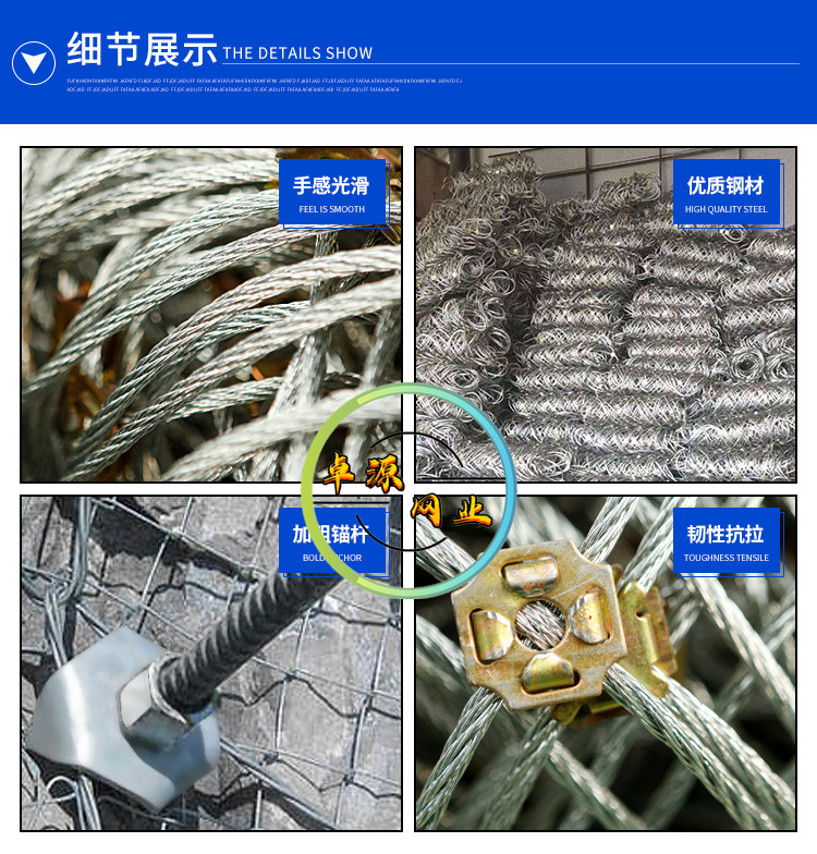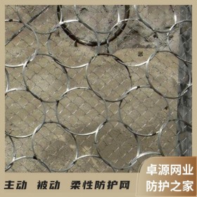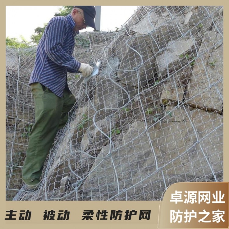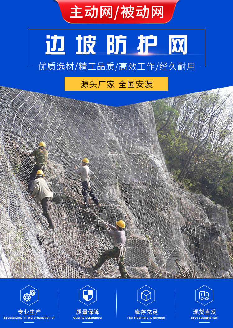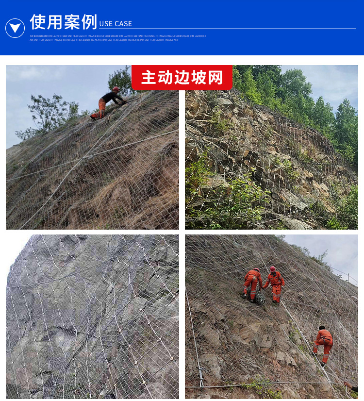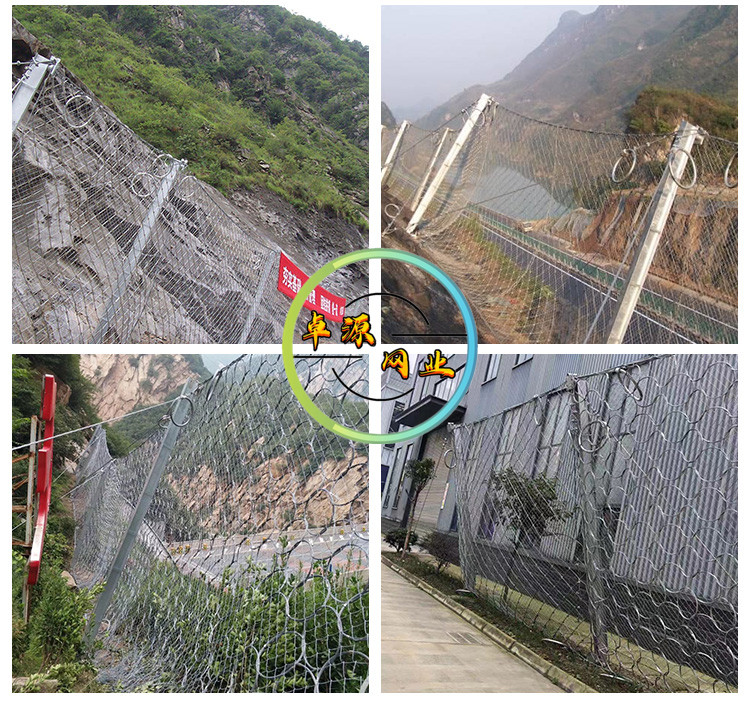 邊坡防護網(wǎng)有主動防護與被動防護,主動防護系統(tǒng)是以鋼絲繩網(wǎng)為主的各類柔性網(wǎng)覆蓋包裹在所需防護斜坡或巖石上,以限制坡面巖石土體的風化剝落或破壞以及為巖崩塌(加固作用),或?qū)⒙涫刂朴谝欢ǚ秶鷥?nèi)運動(圍護作用)。被動防護是由鋼絲繩網(wǎng)、環(huán)形網(wǎng)、(需攔截小塊落石時附加一層鐵絲格柵)、固定系統(tǒng)(錨桿、拉錨繩、基座和支撐繩)減壓環(huán)和鋼柱四個主要部分構(gòu)成。鋼柱和鋼絲繩網(wǎng)連接組合構(gòu)成一個整體,對所防護的區(qū)域形成面防護,從而阻止崩塌巖石土體的下墜,起到邊坡防護作用。