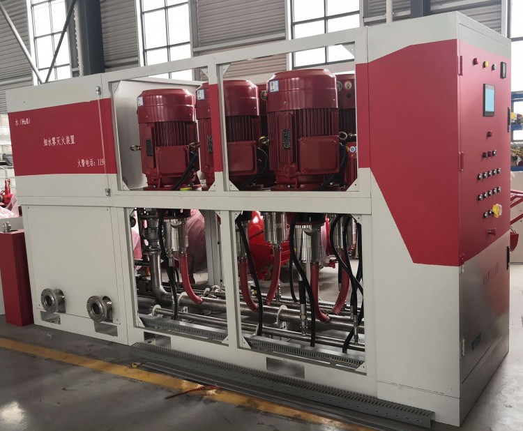 高壓細(xì)水霧滅火系統(tǒng)在準(zhǔn)工作狀況下,從泵組出口至噴頭的管網(wǎng)內(nèi)維持在一定壓力0.8-1.2MPa 范圍內(nèi)。當(dāng)壓力低于穩(wěn)壓泵的設(shè)定啟動(dòng)壓力0.8MPa時(shí),穩(wěn)壓泵啟動(dòng),使系統(tǒng)管網(wǎng)維穩(wěn)在0.8-1.2MPa壓力范圍內(nèi),當(dāng)保護(hù)區(qū)內(nèi)發(fā)生火災(zāi)時(shí),細(xì)水霧玻璃泡破裂,管網(wǎng)液體流動(dòng)流量開關(guān)動(dòng)作, 同時(shí)反饋信號(hào)給火災(zāi)報(bào)警控制器反映火災(zāi)的區(qū)域,火災(zāi)報(bào)警控制器聯(lián)動(dòng)高壓主泵啟動(dòng),系統(tǒng)管道內(nèi)水迅速達(dá)到工作壓力,并通過高壓細(xì)水霧噴頭噴射而出,產(chǎn)生細(xì)水霧撲滅火災(zāi)。