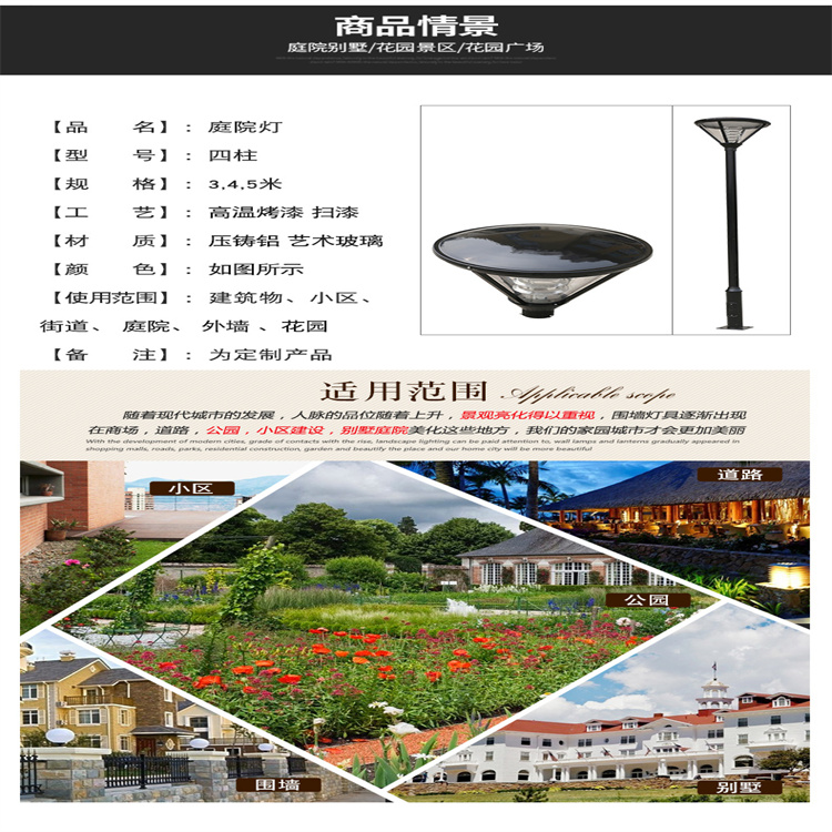 庭院燈主要應(yīng)用于城市慢車(chē)道、窄車(chē)道、居民小區(qū)、旅游景區(qū),公園、廣場(chǎng)等公共場(chǎng)所的室外照明,能夠延長(zhǎng)人們的戶(hù)外活動(dòng)的時(shí)間,提高財(cái)產(chǎn)的安全。庭院燈主要分為歐式庭院燈、現(xiàn)代庭院燈、古典庭院燈三大類(lèi)。因其主要為觀賞景觀照明,所以燈頭多采用燈籠的形式出現(xiàn),外加高度多為2.5米、3米、3.5米以及4米,所以常配置的光源多為L(zhǎng)ED15W、20W或30W.