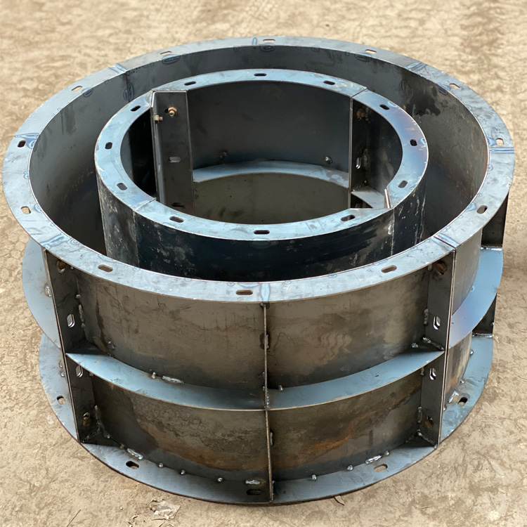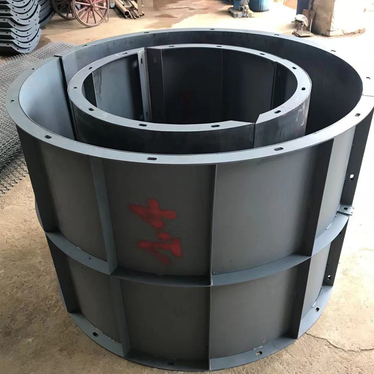 檢查井模板一般都是以圓柱形未生產(chǎn)設(shè)計形狀,這種檢查井模板由于體型設(shè)計的非常大,考慮到使用過程中的變形,因此采用加厚形式的冷鋼板材質(zhì)進(jìn)行加工還是比較合理的,這種檢查井模具采用的板材不能夠隨意選取,需要考慮的因素耐磨性高,抗生銹等特點(diǎn),為了達(dá)到更好的使用效果,這種模具的內(nèi)外模芯都是采用能夠分解組裝的方式進(jìn)行設(shè)計,這樣更好的詮釋了這種水泥構(gòu)件出模的完整性特點(diǎn),而檢查井模具的內(nèi)外板芯的設(shè)計都是不同的,雖然都是螺栓相互連接,但是內(nèi)部模板的拆解需要分解成三部分形式才能夠達(dá)到更好,更完整的脫模工作,外部相對來說就顯得很簡單,只需要兩個對半即可以。