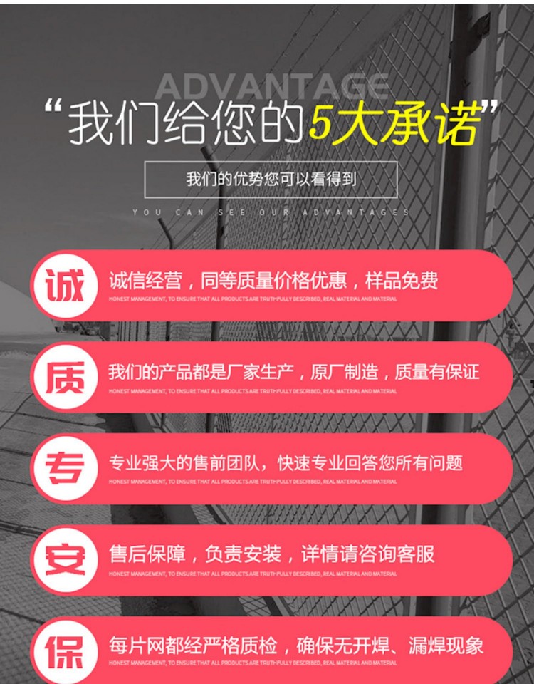 網(wǎng)片尺寸:標(biāo)準(zhǔn)規(guī)格1800×2500mm。非標(biāo)準(zhǔn)高度限于2500mm,長(zhǎng)度限于3000mm 也可定做。