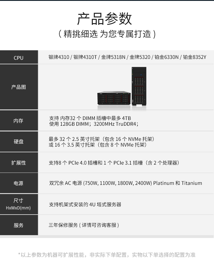 【原廠工程師推薦配置】:4U機架式服務(wù)器,標(biāo)配2*Gold 5120 14C 105W 2.2GHz Processor,可支持4顆CPU(需要添加CPU內(nèi)存板7B27A03953),標(biāo)配4個16GB TruDDR4 2666 MHz (1Rx4 1.2V) RDIMM內(nèi)存,支持48個DDR4內(nèi)存插槽,標(biāo)配無硬盤,標(biāo)配8個2.5"硬盤背板插槽,16個2.5"硬盤背板插槽,標(biāo)配RAID 730-8i 1GB Cache PCIe 12Gbps 陣列卡(支持8個硬盤),支持RAID0/1/10/5/50,標(biāo)配4個集成1GbE RJ-45網(wǎng)口(LOM卡)和1個管理網(wǎng)絡(luò)端口,支持11個PCIe 3.0插槽(含RAID插槽),標(biāo)配2個1100W白金級熱插拔電源模塊(滿配),前置1個USB2.0(XClarity管理接口),1個USB3.0接口,光通路診斷LED報警燈,3年7*24*4上門