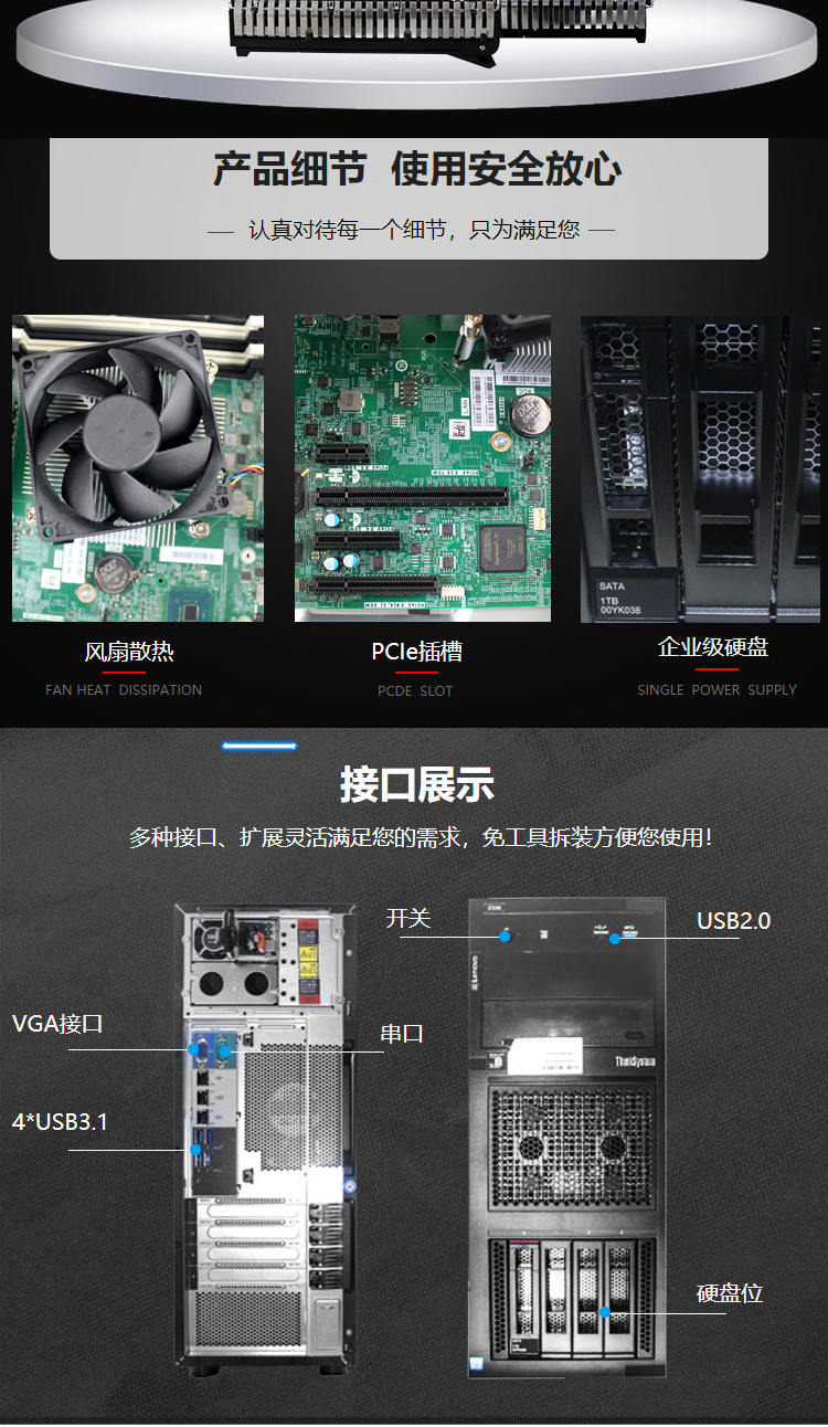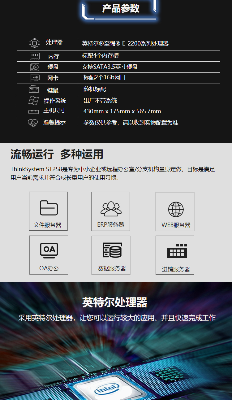 【原廠工程師推薦配置】:ThinkServer RS260,1U機(jī)架式服務(wù)器,1*英特爾 至強(qiáng) 處理器 E3-1220 v6(4C,3.0 GHz,主板集成顯卡),1*8GB ECC Unbuffer 2400 DDR4內(nèi)存,4條擴(kuò)展插槽,支持64GB內(nèi)存擴(kuò)展,2*3.5盤位,1*1TB 7.2K 3.5寸企業(yè)級熱插拔SATA硬盤,板載RAID121i 0/1/10/5,擴(kuò)展槽1個PCI-E 3.0 x16,板載2x Gb網(wǎng)卡和1x Gb管理網(wǎng)卡,USB 3.0 (2前4后)串口 (1個后置)VGA (1個后置),300W電源,DVD光驅(qū),3年有限上門保修&基礎(chǔ)安裝。