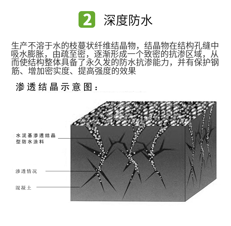 水泥基滲透結(jié)晶活性母料是一種具有特殊活性的物質(zhì),通過水為載體,隨著水對混凝土結(jié)構(gòu)孔隙進(jìn)行的滲透,活性母料成分被帶進(jìn)砼結(jié)構(gòu)的內(nèi)部孔縫中,其活性化合物能在混凝土內(nèi)部進(jìn)行傳輸、膨脹、產(chǎn)生物化反應(yīng),形成不溶于水的枝蔓狀結(jié)晶物,而使混凝土結(jié)構(gòu)得到充盈密實,發(fā)揮抗?jié)B防水作用。