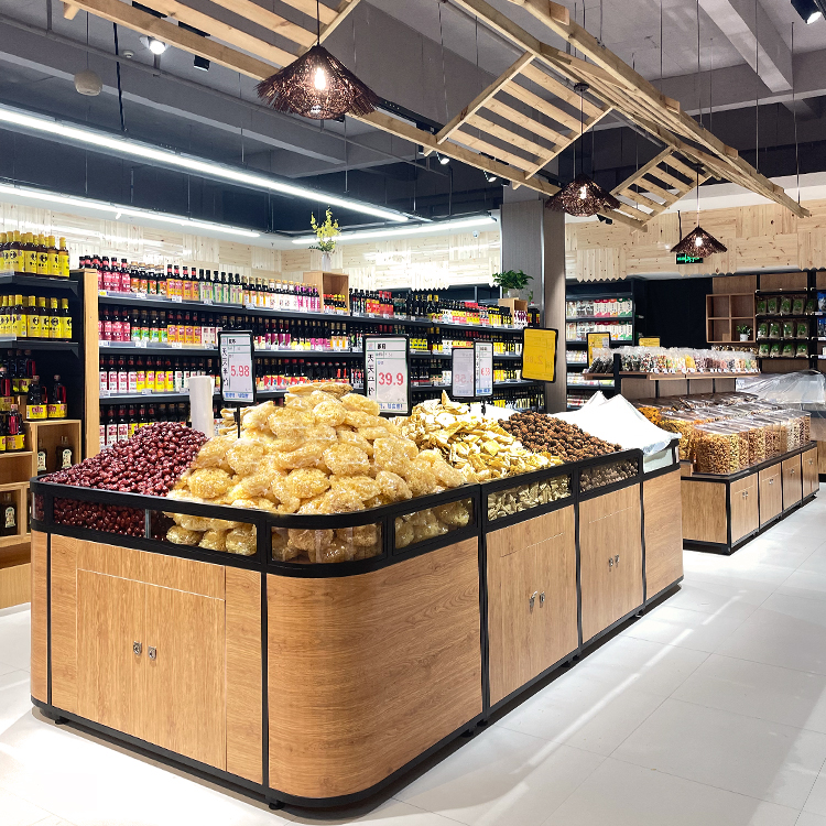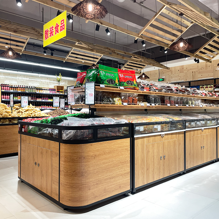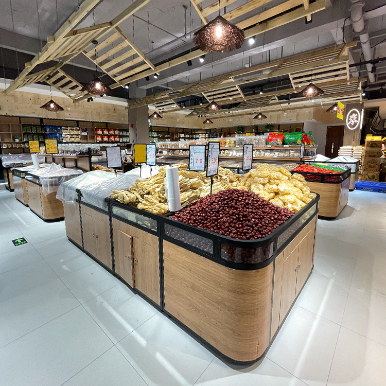 散裝零食陳列架超市中島散裝柜木制五谷雜糧展示架子貨架生產(chǎn)廠家