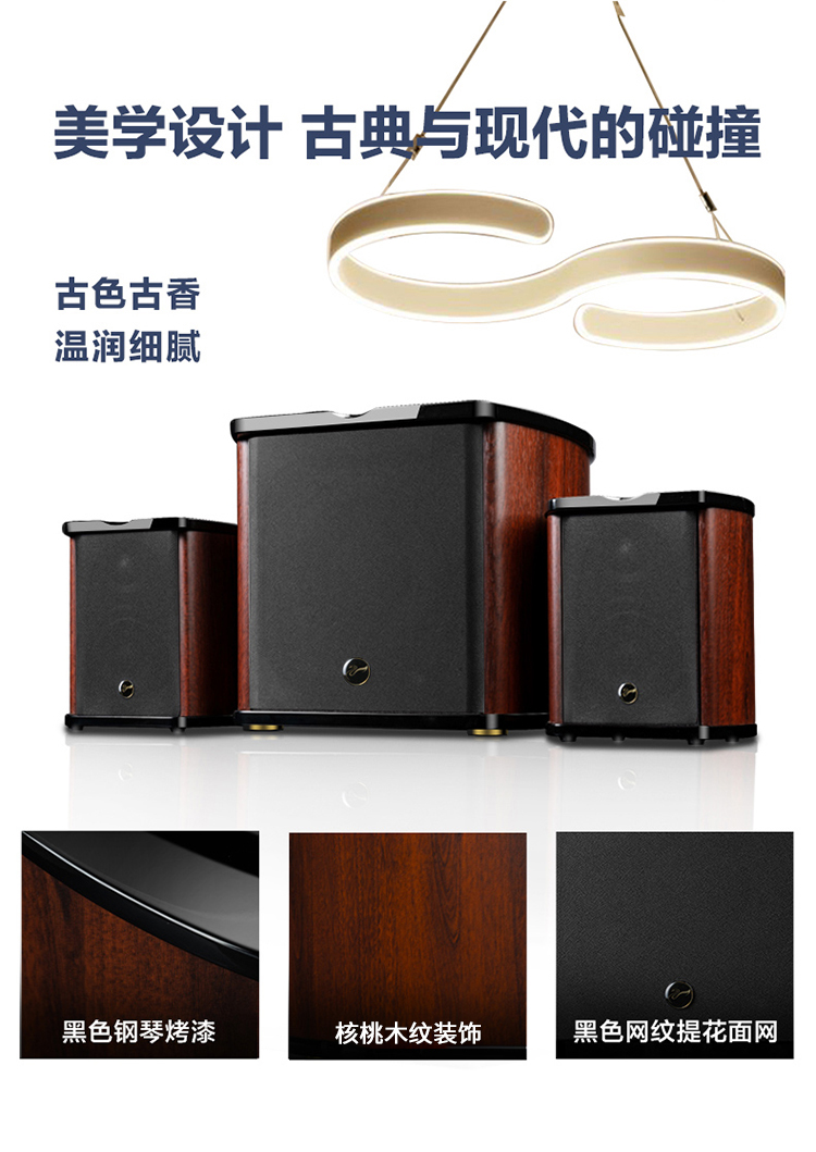 箱體外觀: 黑色鋼琴烤漆+豪華核桃+黑色網(wǎng)紋提花面網(wǎng)布