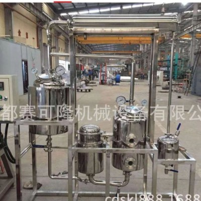 將需提取物料投入提取罐內(nèi),按生產(chǎn)工藝加入一定比例的溶媒如水、乙醇、甲醇、丙酮等(根據(jù)工藝自行加入)。進(jìn)行原料提取,提取溫度可根據(jù)實際需要設(shè)定。按生產(chǎn)工藝進(jìn)行提取,待提取結(jié)束后,將管道閥門按先后順序打開,把液體抽入濃縮罐進(jìn)行濃縮。濃縮液溫度設(shè)定在需要值,真空度保持在-0.05到-0.09MPA,濃縮時產(chǎn)生的二次蒸汽經(jīng)過冷凝器與冷卻器變成冷凝液回流至提取罐做新溶劑加入藥里,新溶劑由上而下通過原材層到提取罐底部,原材中的可溶性成分溶解于提取罐內(nèi)溶劑,送至提取罐做新溶劑,形成新溶劑回流提取,直至完全溶出(提取液無色)濃縮繼續(xù)進(jìn)行,直至濃縮成需要的比重物料,提取罐內(nèi)的無色液體可下次復(fù)用。