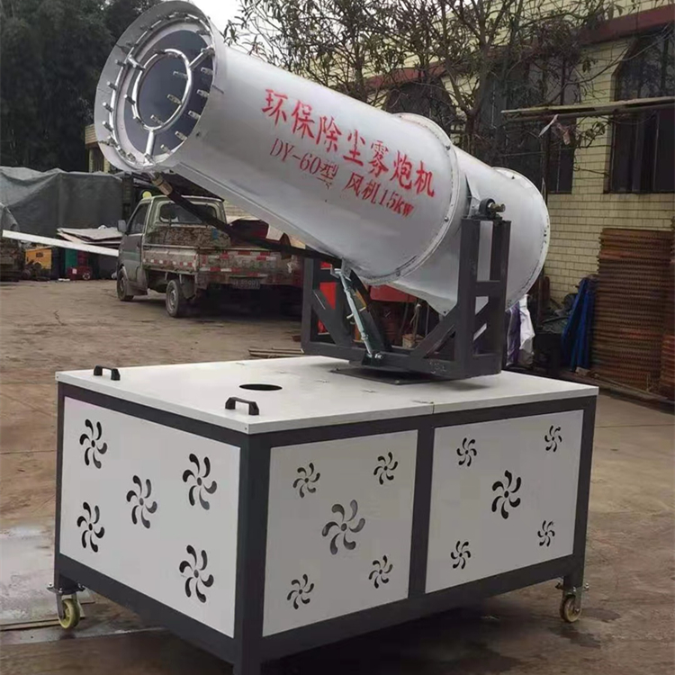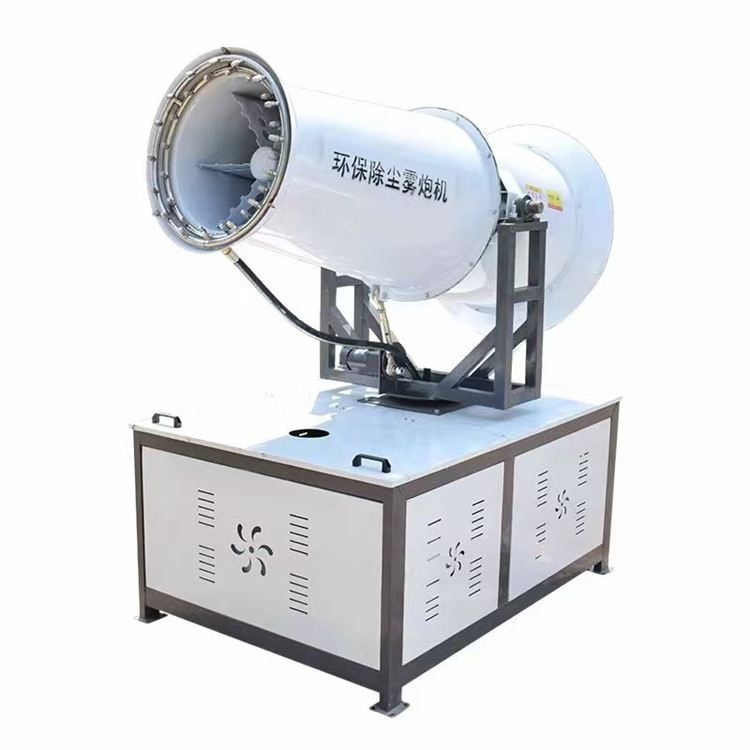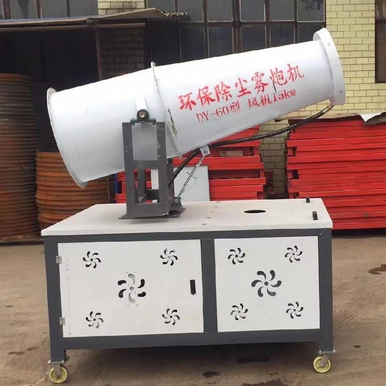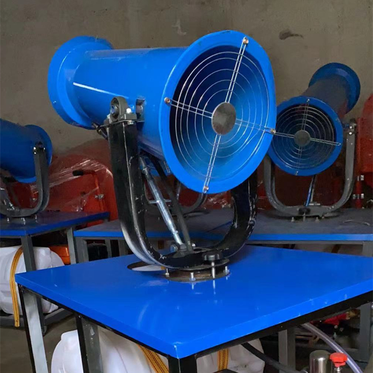霧炮機(jī)是根據(jù)風(fēng)送原理,先使用進(jìn)口高壓泵、微細(xì)霧化噴嘴將水霧化,再利用風(fēng)機(jī)風(fēng)量和風(fēng)壓將霧化后的水霧送到較遠(yuǎn)距離,使得水霧到達(dá)較遠(yuǎn)距離同時(shí)能夠要蓋更大面積,水霧與粉塵凝結(jié)后降落,從而達(dá)到降塵目的。