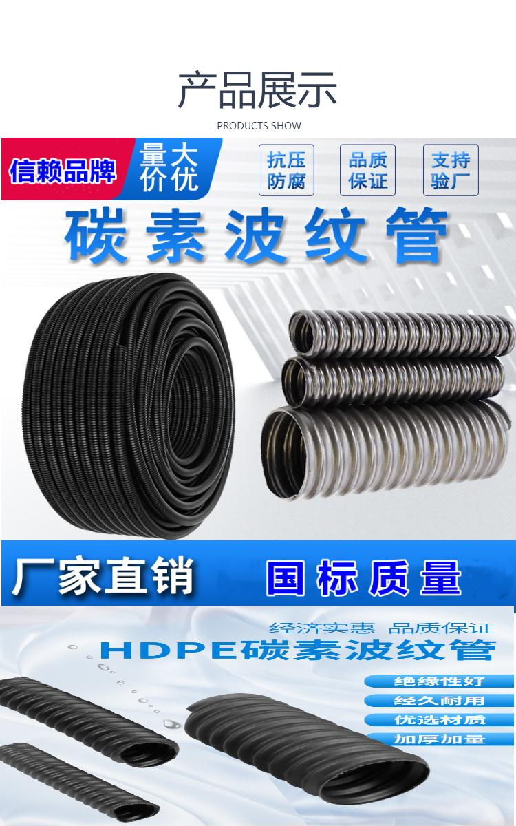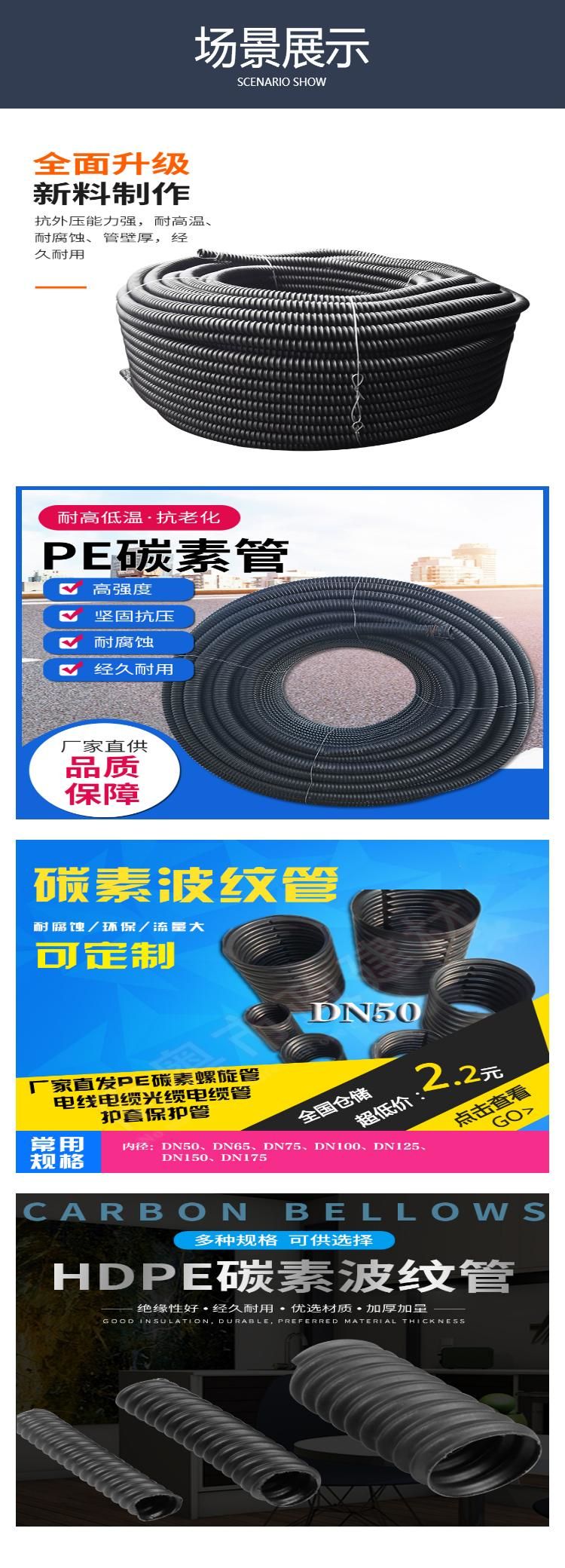 "碳素波紋管是采用HDPE(高密度聚乙烯)與碳素復(fù)合材料擠出成型和獨特的旋轉(zhuǎn)成型工藝技術(shù)生產(chǎn)的新型電力線纜保護(hù)管道。