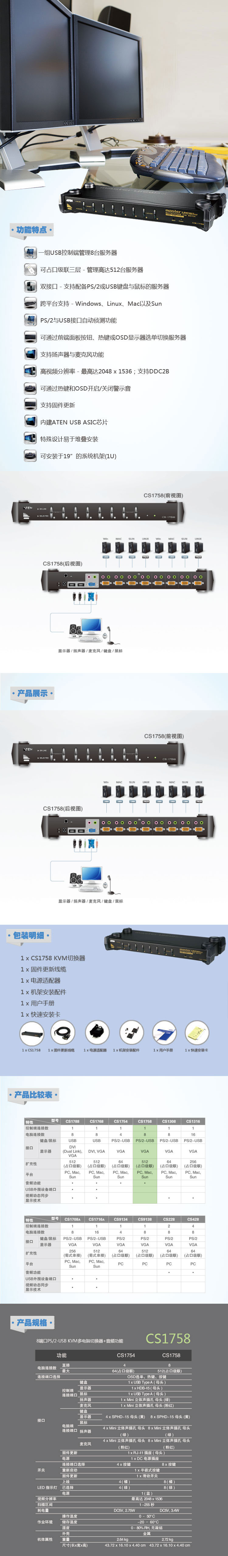 aten 宏正 四川成都 KVM服務(wù)分銷商 CS1758 8端口PS/2-USB 機(jī)架式 KVM多電腦切換器+音頻功能 八進(jìn)一出 CS1758-AT-Z