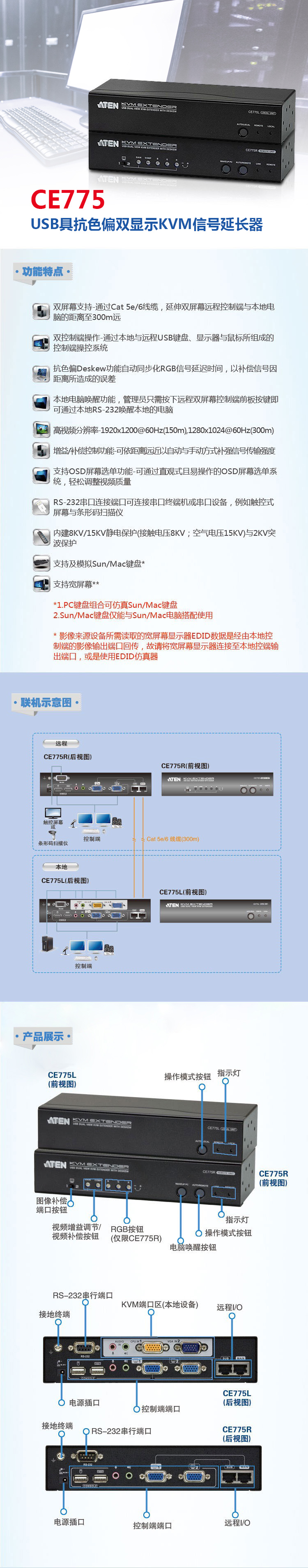 ATEN 宏正 CE775 USB-VGA 雙顯 KVM 延長(zhǎng)器(需訂貨)
