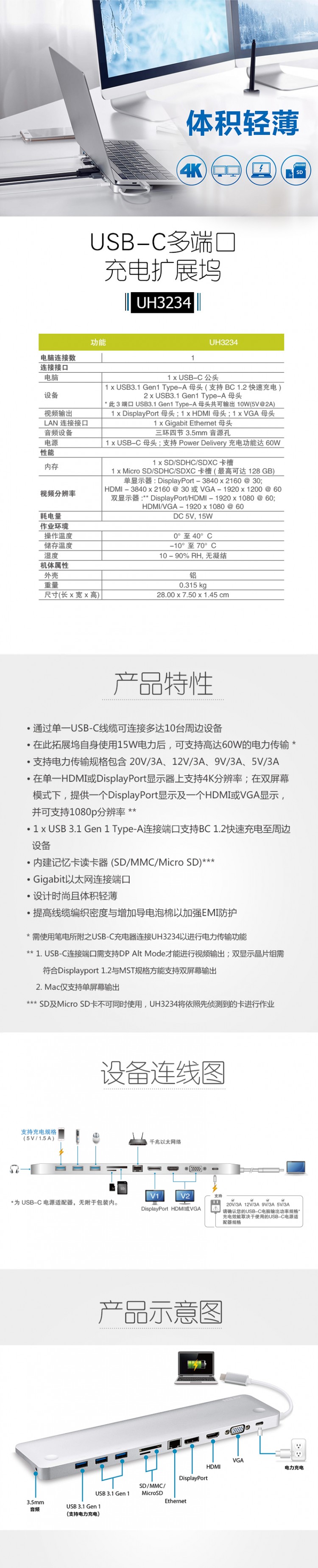 UH3234只需通過一條線纜即可從筆記本電腦將視頻影像傳送到一個(gè)DisplayPort或HDMI顯示 器,分辨率可高達(dá)4K ;也可以支持一個(gè)HDMI或VGA及一個(gè)DisplayPort提供鏡面或延伸雙屏幕 模式,分辨率高達(dá)1080P。
