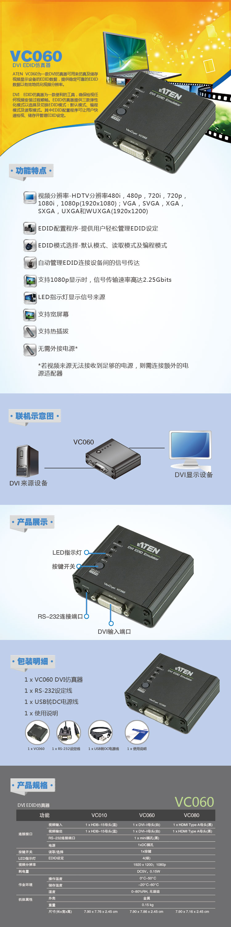 ATEN VC060為一款DVI仿真器可用來仿真及儲(chǔ)存視頻顯示設(shè)備的EDID數(shù)據(jù),提供穩(wěn)定可靠的EDID數(shù)據(jù)以有效地優(yōu)化視頻分辨率。DVI EDID仿真器為一款便利的工具,確保檢視任何視頻安裝過程順暢。EDID仿真器提供三款彈性化模式以選擇及切換EDID模式:默認(rèn)模式、編程模式及讀取模式。其中EDID配置程序可讓用戶快速檢視、儲(chǔ)存并管理EDID設(shè)定。