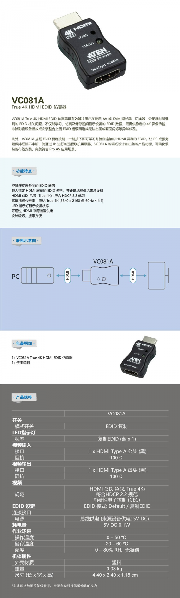 成都 ATEN 宏正 True 4K HDMI EDID 仿真器 VC081A