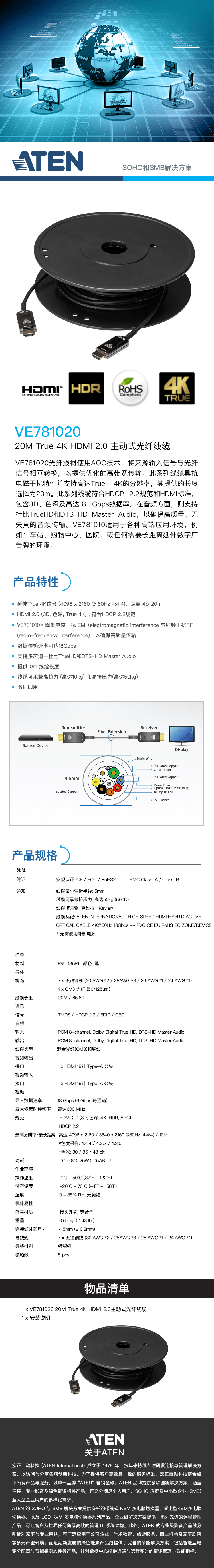 ATEN 宏正 VE781020 20M True 4K HDMI 2.0 主動(dòng)式光纖線纜