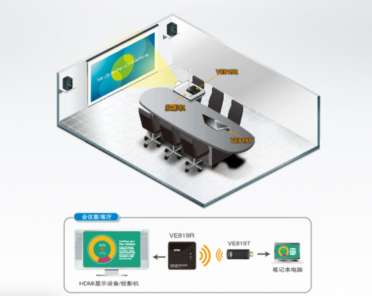 VE819T HDMI Dongle無線信號發(fā)送器是能夠滿足會議室與家庭影院系統(tǒng)需求的理想選擇。其可將未壓縮的Full HD 1080p信號自筆記本電腦、電腦及機頂盒等HDMI設(shè)備傳輸出去。