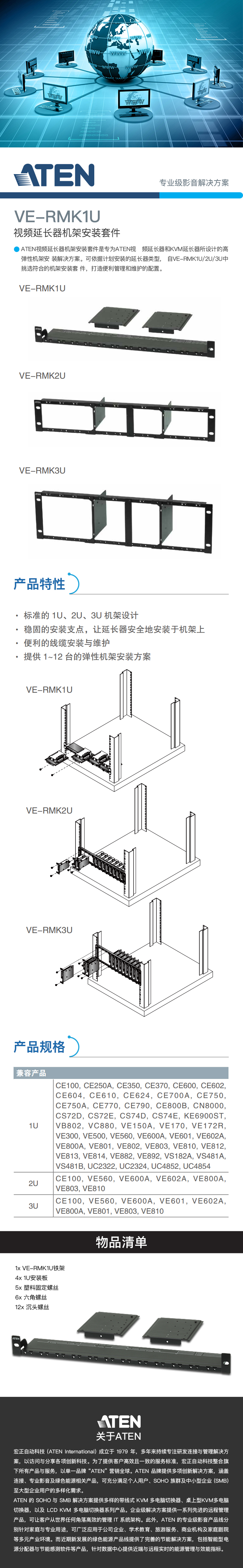 ATEN視頻延長器機(jī)架安裝套件是專為ATEN視 頻延長器和KVM延長器所設(shè)計的高彈性機(jī)架安 裝解決方案??梢罁?jù)計劃安裝的延長器類型, 自VE-RMK1U/2U/3U中挑選符合的機(jī)架安裝套 件,打造便利管理和維護(hù)的配置。