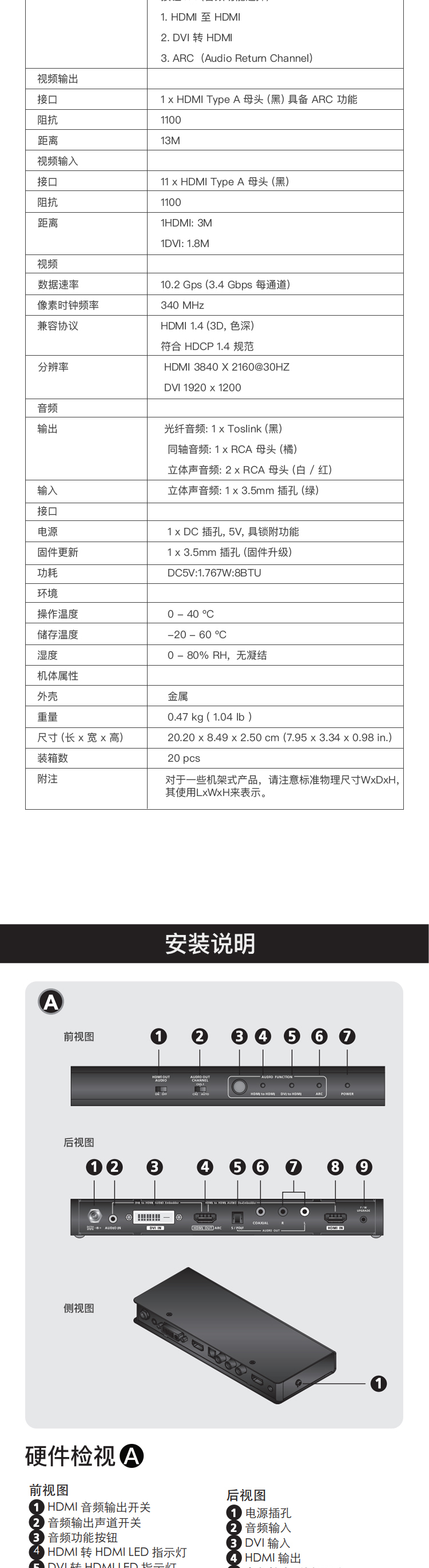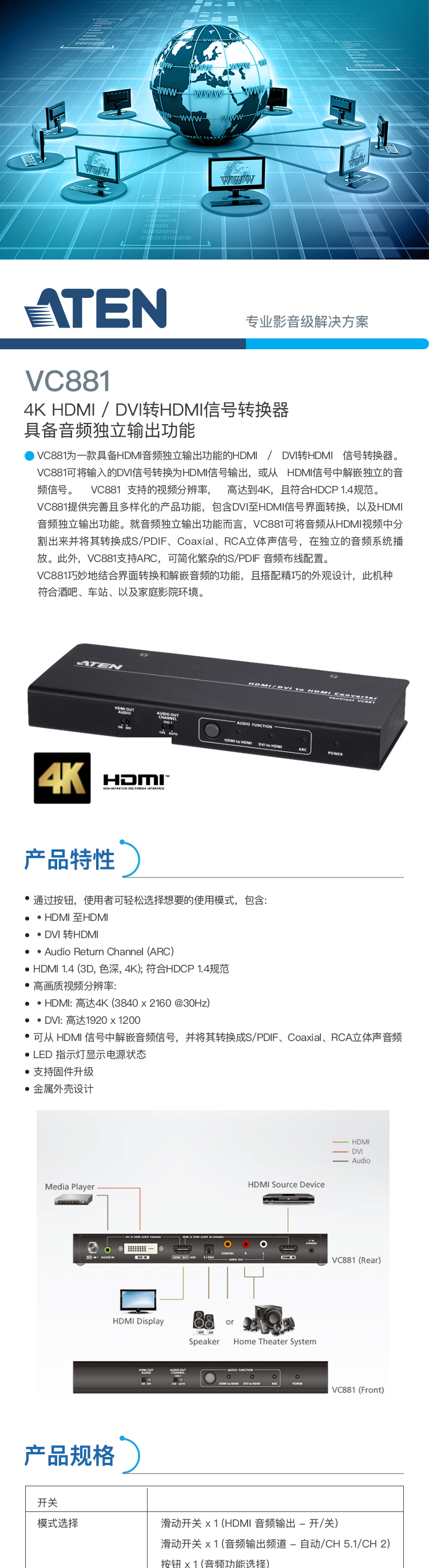 VC881提供完善且多樣化的產(chǎn)品功能,包含DVI至HDMI信號(hào)界面轉(zhuǎn)換,以及HDMI音頻獨(dú)立輸出功能。就音頻獨(dú)立輸出功能而言,VC881可將音頻從HDMI視頻中分割出來(lái)并將其轉(zhuǎn)換成S/PDIF、Coaxial、RCA立體聲信號(hào),在獨(dú)立的音頻系統(tǒng)播放。此外,VC881支持ARC,可簡(jiǎn)化繁雜的S/PDIF 音頻布線配置。