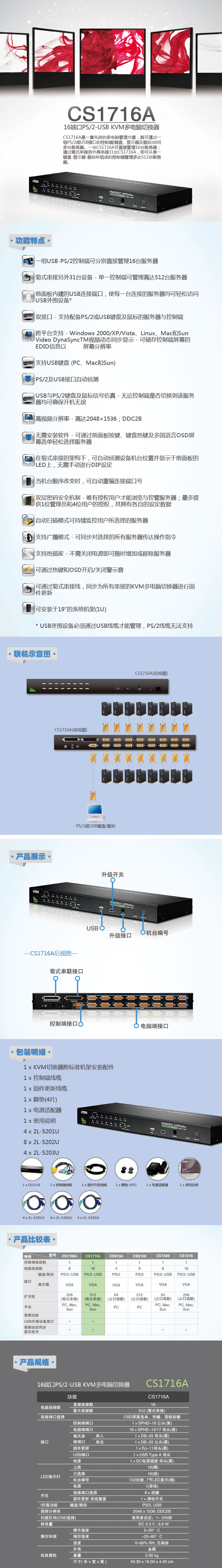 CS1716A是一套先進(jìn)的多電腦管理方案,其可通過(guò)一組PS/2或USB接口的控制端(鍵盤(pán)、顯示器及鼠標(biāo))訪(fǎng)問(wèn)多臺(tái)服務(wù)器。一臺(tái)CS1716A可直接管理16臺(tái)服務(wù)器;通過(guò)菊式串接另外再串接31臺(tái)CS1716A,即可從單一鍵盤(pán)-顯示器-鼠標(biāo)所組成的控制端管理多達(dá)512臺(tái)服務(wù)器。