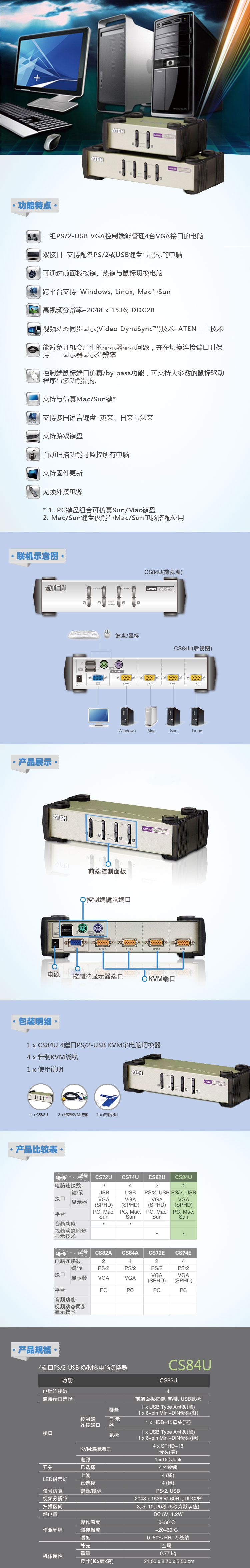 CS84U安裝簡易且快速,僅需將線纜連接至適當?shù)倪B接端口,不需設(shè)定或安裝軟件,且不會有不兼容的問題;此外,CS84U可直接擷取鍵盤輸入信號,能支持跨平臺的運作。