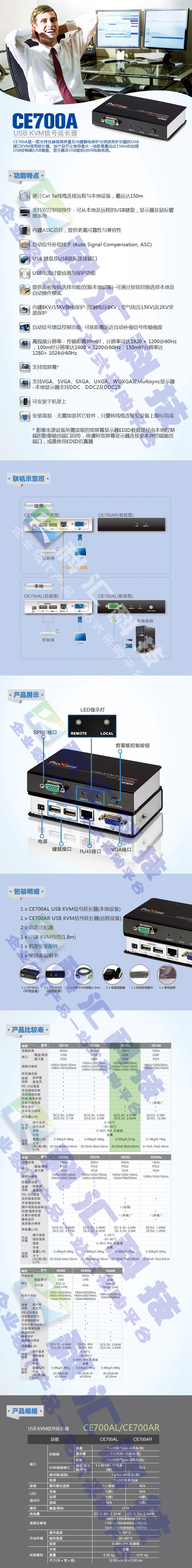 CE700A是一款支持優(yōu)越視頻質(zhì)量及內(nèi)建靜電保護(hù)與突波保護(hù)功能的USB接口KVM信號(hào)延長(zhǎng)器。該產(chǎn)品可讓使用者從一組距離遠(yuǎn)達(dá)150m的遠(yuǎn)程USB控制端(USB鍵盤、顯示器及USB鼠標(biāo))訪問(wèn)電腦系統(tǒng)。