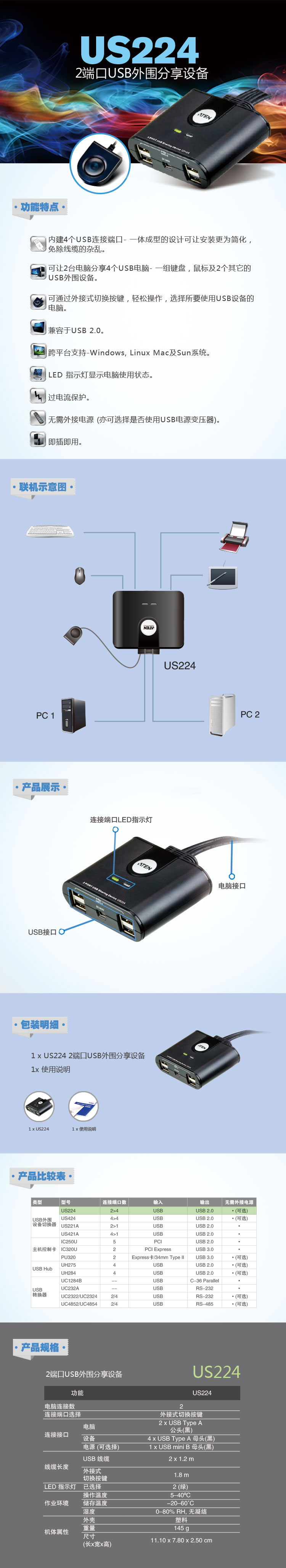 US224 2端口USB外圍分享設(shè)備可讓2臺電腦分享4個(gè)USB設(shè)備-一組鍵盤,鼠標(biāo)及2個(gè)其它的USB外圍設(shè)備。不需為每臺電腦都購置單獨(dú)的USB鍵盤,鼠標(biāo)及USB外圍設(shè)備。其一體成型的設(shè)計(jì)可讓安裝更為簡化-無需額外連接2條USB線纜至電腦,免除了線纜的雜亂。