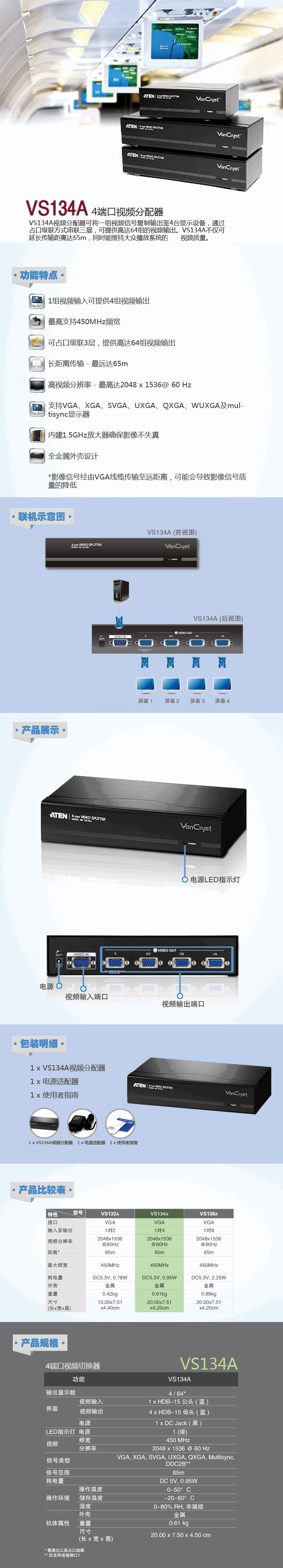 ATEN 宏正 VS134A 4端口視頻分配器 KVM多電腦切換器