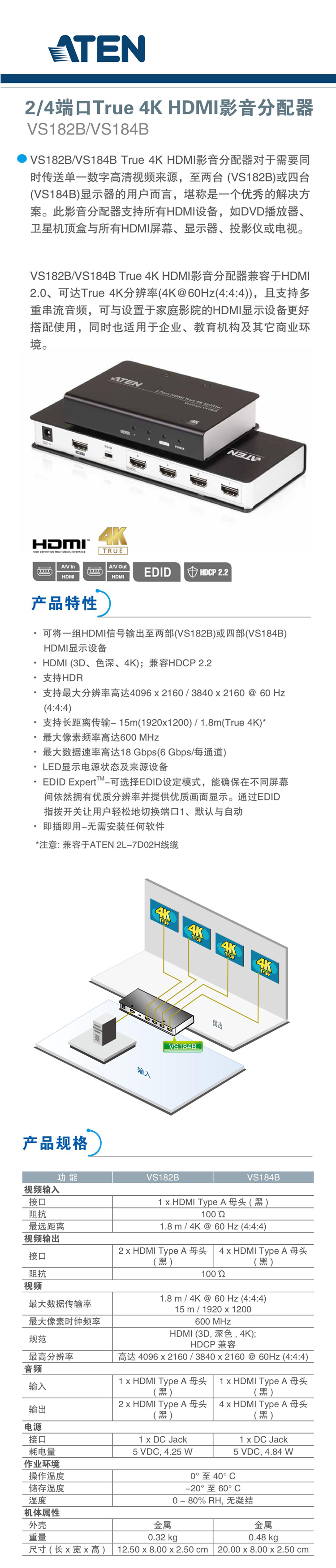 成都 ATEN宏正 VS182B 2端口HDMI 影音分配器 2-Port True 4K HDMI Splitter