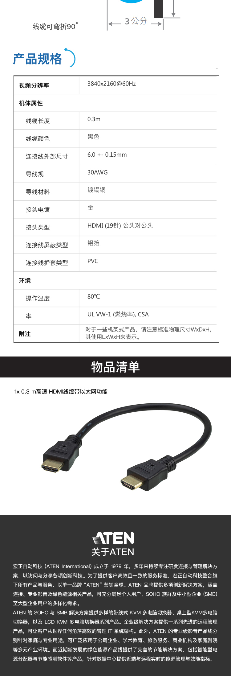 成都 ATEN 宏正 2L-7DA3H-AZ,0.3 m高速 HDMI線纜帶以太網(wǎng)功能 分辨率達(dá)4K