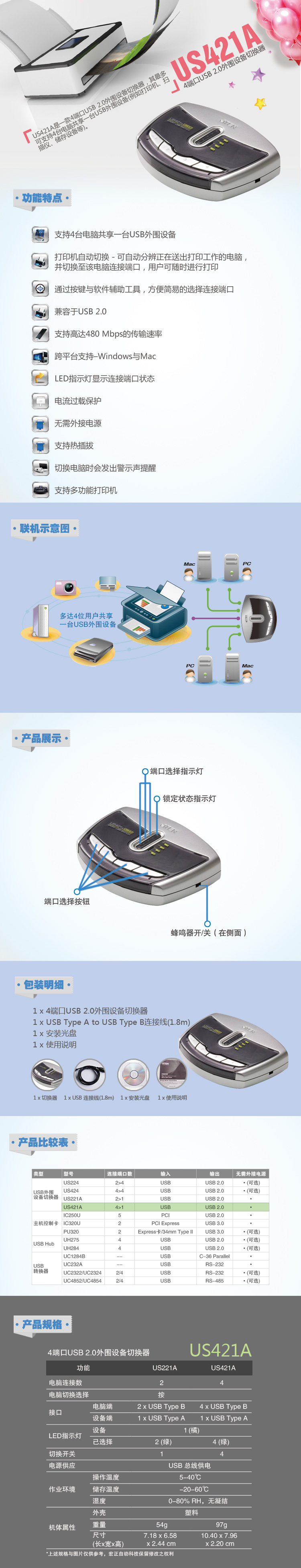 US421A是一款4端口USB 2.0外圍設備切換器,多可支持4臺電腦共享一臺USB外圍設備(例如打印機、掃描儀、儲存設備等)。