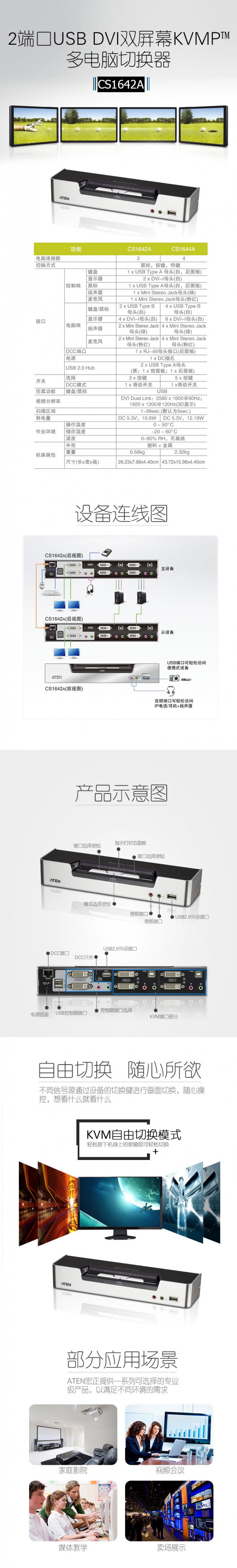 ATEN宏正 CS1642A 2端口USB DVI雙屏幕KVM多電腦切換器