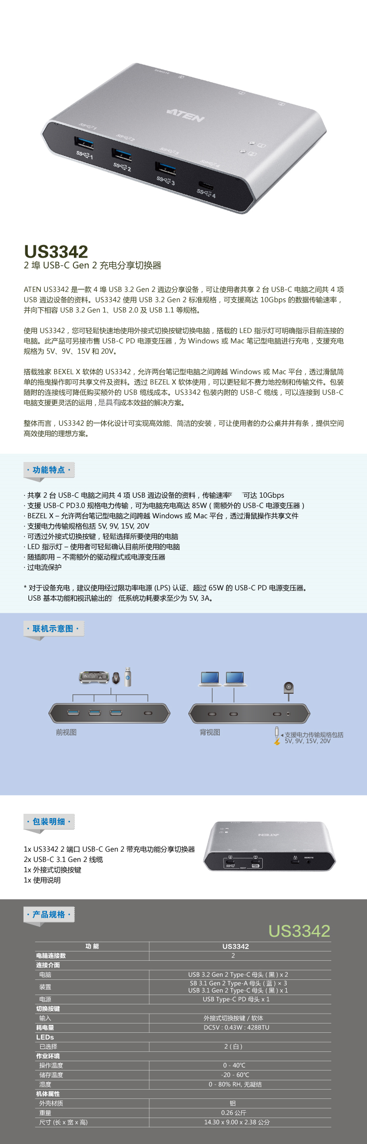 ATEN US3342 是一款4 端口USB 3.2 Gen 2 外圍分享設(shè)備,允許用戶在兩臺(tái)不同的支持USB-C的筆記本電腦中的四個(gè)USB設(shè)備之間共享數(shù)據(jù)。US3342 使用USB 3.2 Gen 2 標(biāo)準(zhǔn)規(guī)格,可支持高達(dá)10Gbps 的數(shù)據(jù)傳輸速率,并兼容USB 3.1 Gen 1、USB 2.0 和USB 1.1 等規(guī)格。