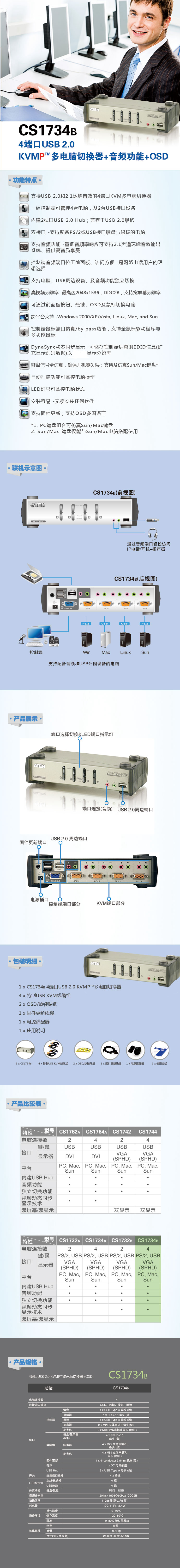 CS1734B是內(nèi)建2端口USB 2.0 Hub的4端口KVMP™多電腦切換器,用戶可通過(guò)一組鍵盤(pán)、屏幕及鼠標(biāo)所組成的控制端,集中管理4臺(tái)電腦。用戶也可通過(guò)前面板按鈕、熱鍵、OSD及鼠標(biāo)四種方式輕松進(jìn)行電腦切換。