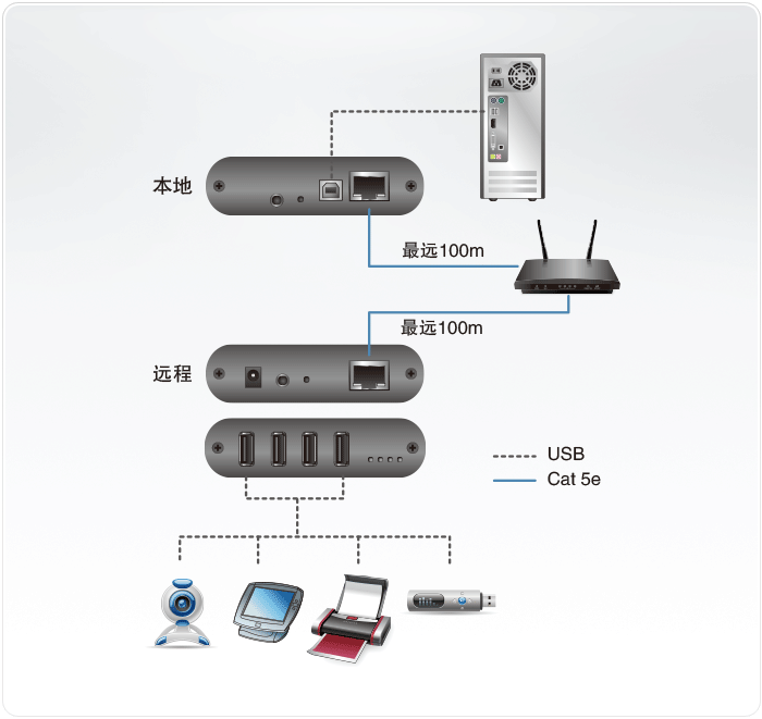 1.通過(guò)Gigabit 以太網(wǎng)絡(luò)(LAN)延長(zhǎng)USB信號(hào)傳輸
