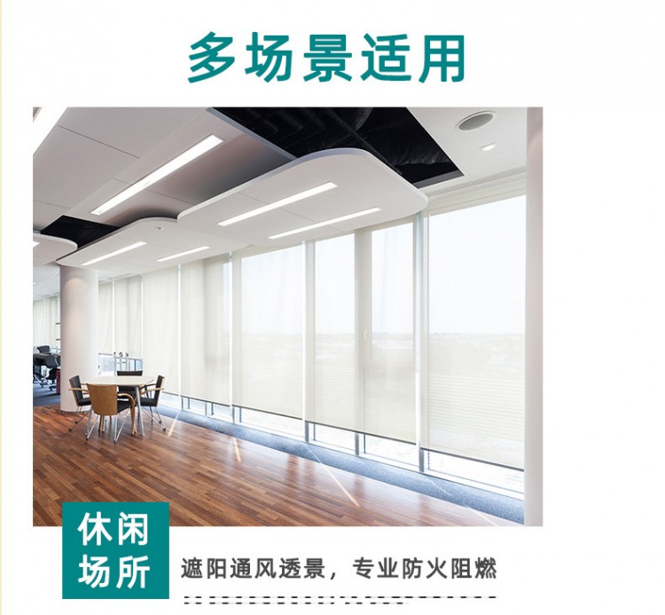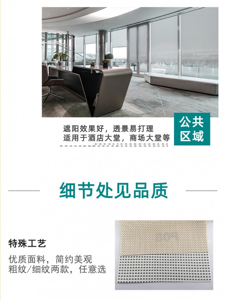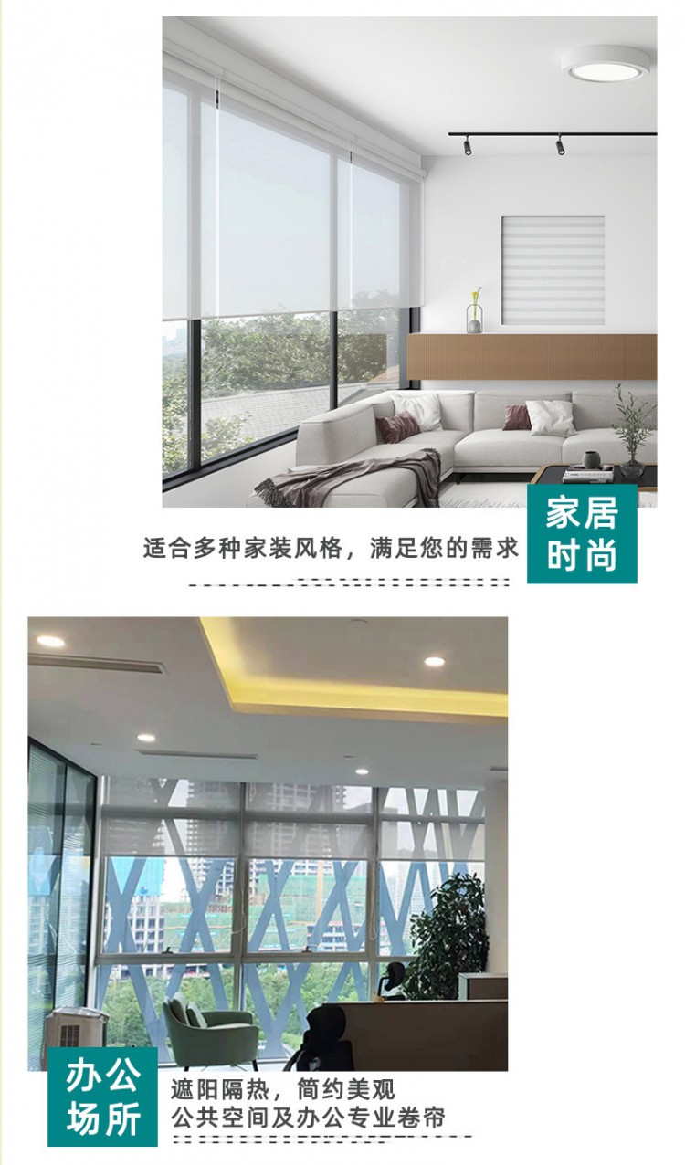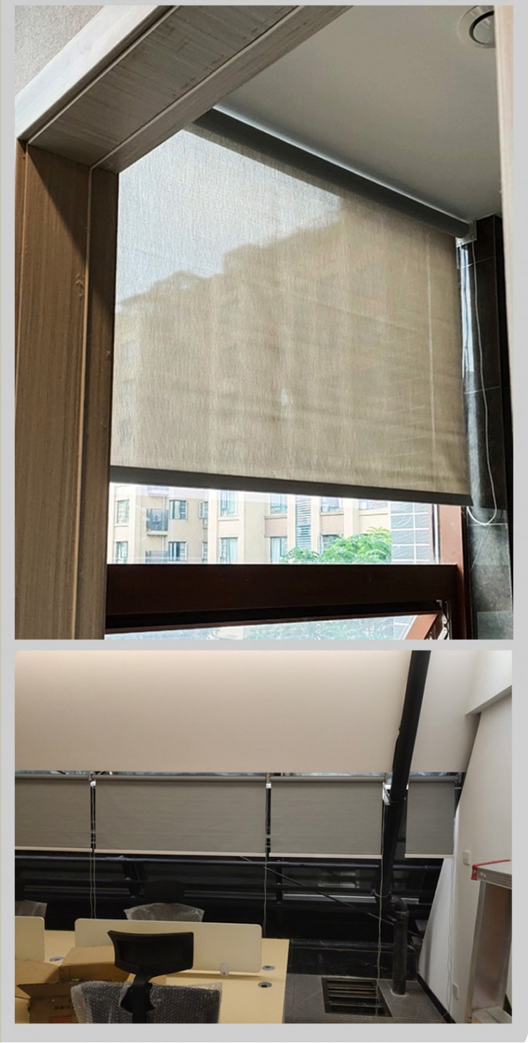 卷簾是目前比較主流的辦公窗簾。優(yōu)點是品種豐富,價格適中,大方簡潔,遮陽性能佳,安裝方便。缺點是不易清洗。但現(xiàn)在也出現(xiàn)了很多種材質(zhì)的卷簾,易于清水擦洗。卷簾目前分拉珠簾和彈簧定位簾及電動簾三種。并有超薄、遮陽、加厚等不同規(guī)格。主要分為全遮光、半遮光即陽光卷簾兩類。是辦公用窗簾的選擇。全遮光卷簾建議使用于陽光強烈的窗戶或辦公區(qū)。其他光線不是很強烈或者需要一定透光效果的場合可選用半遮光卷簾。