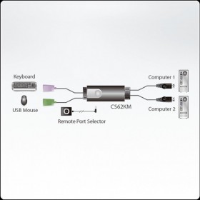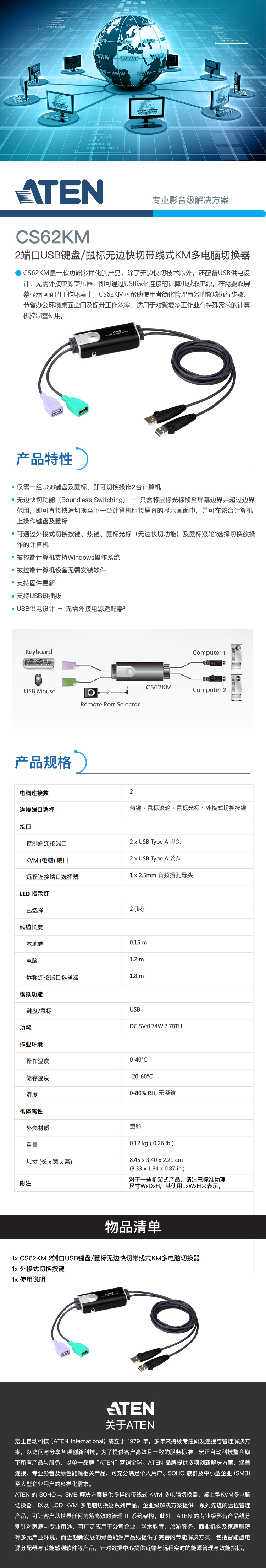 CS62KM為一款2端口USB界面鍵盤/鼠標連接的無邊快切帶線式多電腦切換器,使用者只需通過一組鍵盤、鼠標控制端即可快速切換操作2臺計算機。CS62KM提供多種選擇切換欲操作計算機設(shè)備的方式,使用者可通過外接式切換按鍵、鍵盤熱鍵、鼠標光標及鼠標滾輪切換操作計算機。其中,鼠標光標切換操作計算機的方式采用了ATEN的無邊快切(Boundless Switching)技術(shù),使用者只需將鼠標光標移至屏幕邊界并超過邊界范圍,即可直接快速切換至另一臺計算機所接熒幕的顯示畫面中,并可在該臺計算機上操作鍵盤及鼠標。