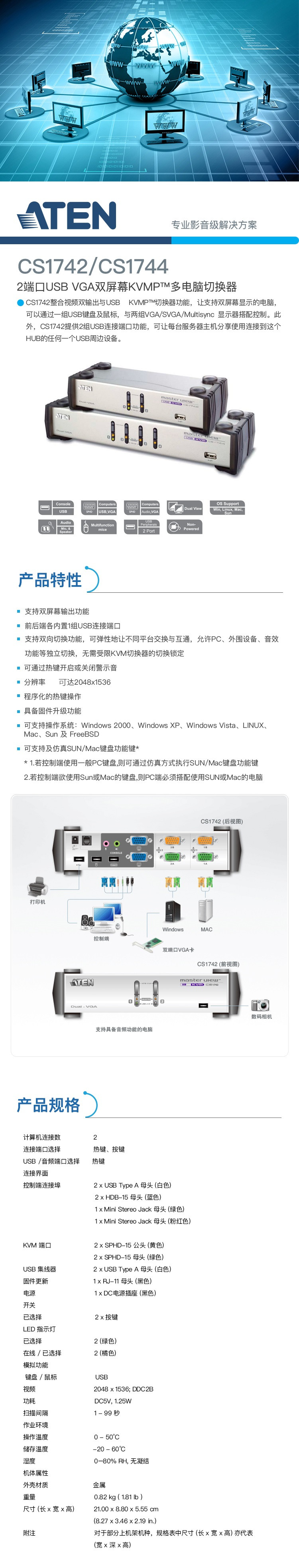 CS1742整合視頻雙輸出與USB KVMP™切換器功能,讓支持雙屏幕顯示的電腦,可以通過一組USB鍵盤及鼠標(biāo),與兩組VGA/SVGA/Multisync 顯示器搭配控制。此外,CS1742提供2組USB連接端口功能,可讓每臺服務(wù)器主機分享使用連接到這個HUB的任何一個USB周邊設(shè)備。