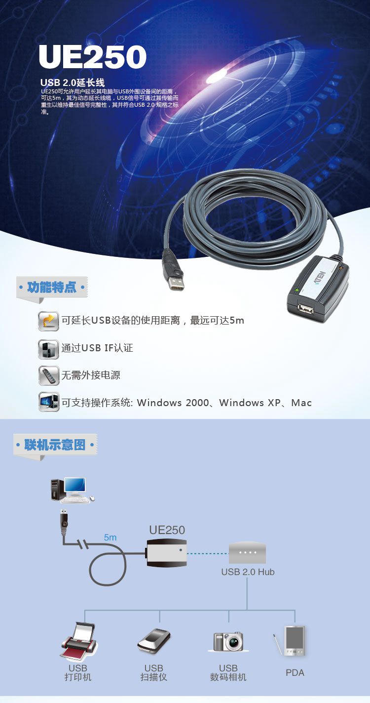 UE250可允許用戶延長其電腦與USB外圍設備間的距離,可達5m,其為動態(tài)延長線纜,USB信號可通過其傳輸而重生以維持信號完整性,其并符合USB 2.0 規(guī)格之標準。